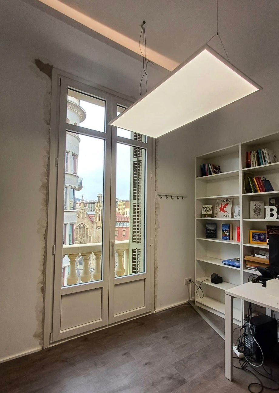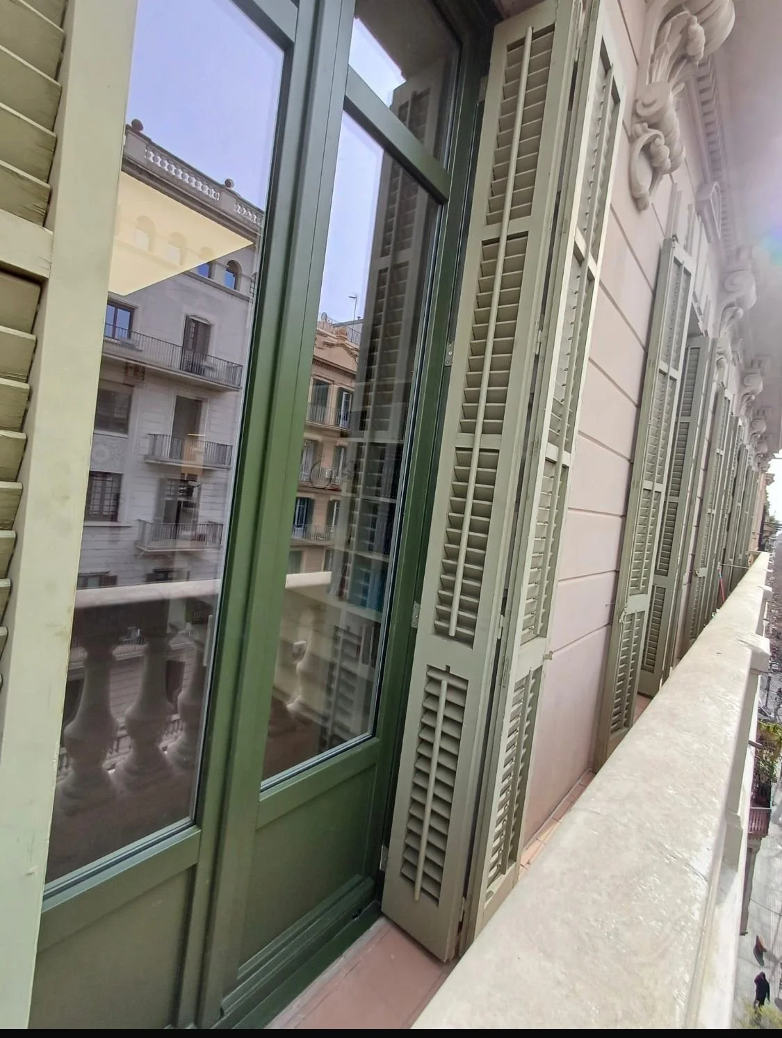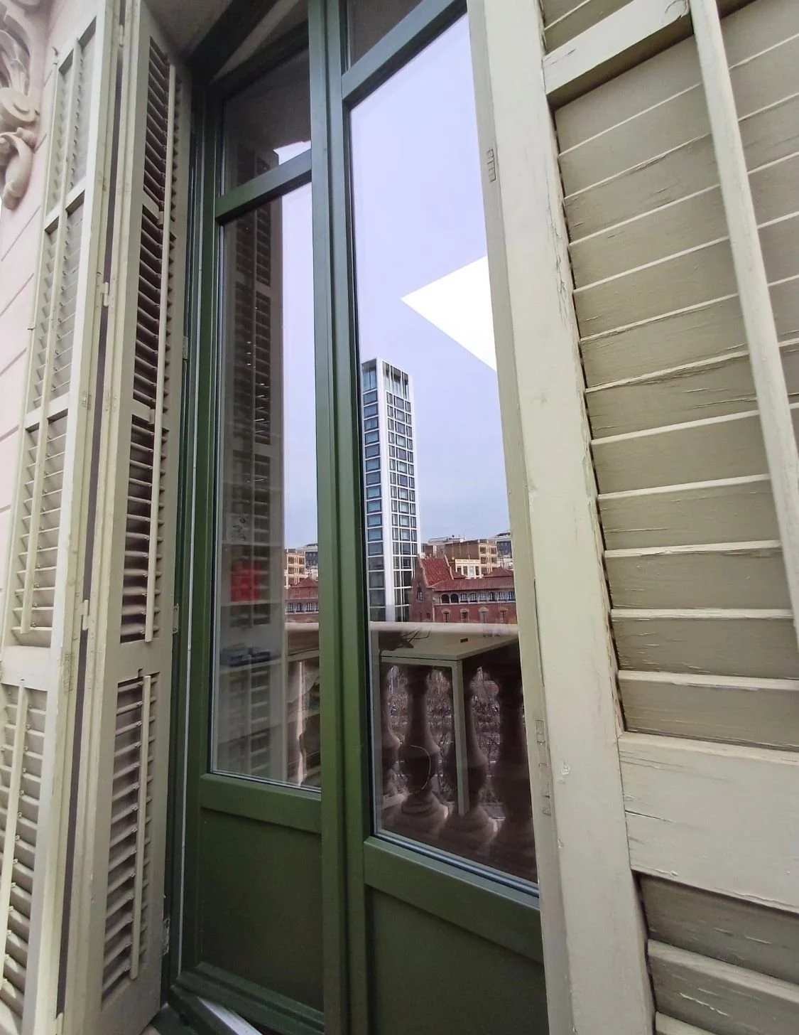 Proyecto de rehabilitación en el centro de Barcelona. Consiste en la instalación de 1 unidad de carpintería PVC Serie 70, con acabado blanco en el interior y lacado exterior en RAL 6003, que se integra perfectamente con la estética clásica de la fachada y los balcones del edificio. Esta solución permite mantener la imagen arquitectónica original mientras se mejora notablemente el aislamiento térmico y acústico de la vivienda.